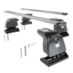 Visiškai sukomplektuoti stogo bagažinės skersiniai su metaliniais-kvadratiniais 32x22x2 mm strypais, kurie yra aptraukti juodo poliesterio plastiku.